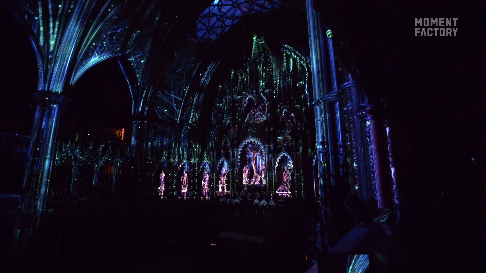The Fabrique of Notre-Dame de Montreal commissioned Moment Factory to create a permanent experience with sound, light, and video, inviting visitors to rediscover the Notre-Dame Basilica in Old Montreal. Under the creative direction of Bruno Ribeiro, this monumental projection highlights the building’s architectural finesse, the artistic richness of its reliefs, and the evocative power of this iconic landmark.