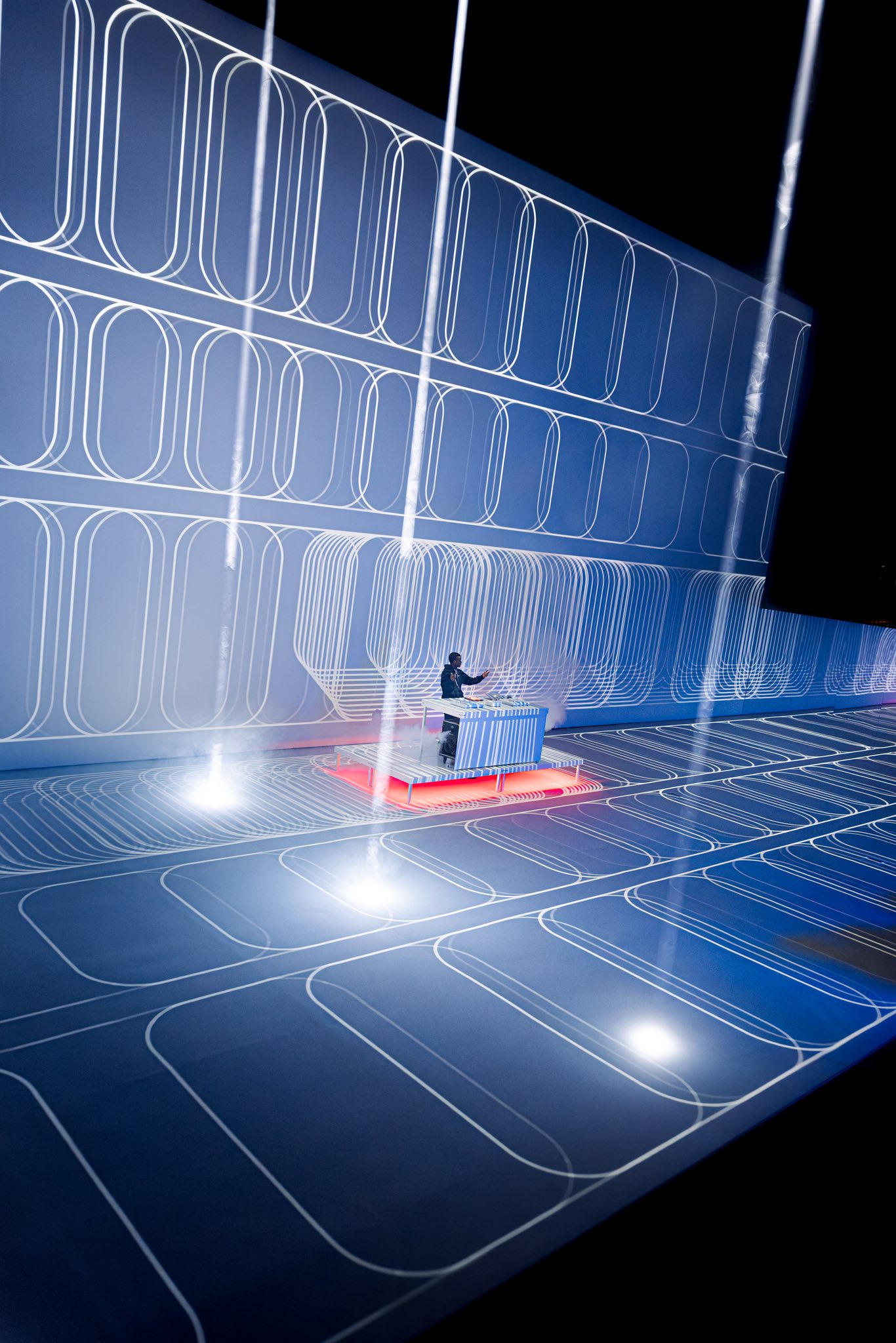 A tribute to raves and free parties that peaked in the early 2000s, Stroboscope takes the form of a matrix of high-intensity spotlights suspended overhead, shaping a luminous space in constant flux. Here, music is translated into a choreography of light, giving sonic frequencies an almost tangible presence and visually radiating their energy throughout the entire space.